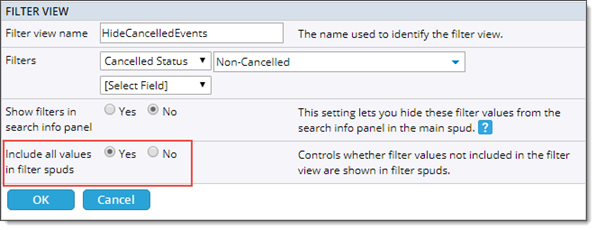 Important If you set up a filter view without an accompanying filter spud (that is, you're not Using a filter control spud and filter view together), don't include it in the Search info panel. Without a filter spud, the filter view field has no label, so the value(s) you select for the field appear in the Search info panel without any label. In this case, rather than accepting all the defaults, set Show filters in search info panel to No, such as in this example: