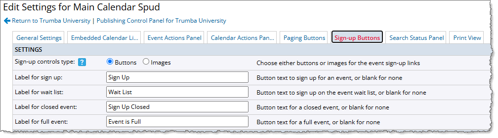 The registration button names can be changed on the Sign-Up Buttons tab by editing the Main Calendar spud settings. The button names above correspond with the screenshot below.
